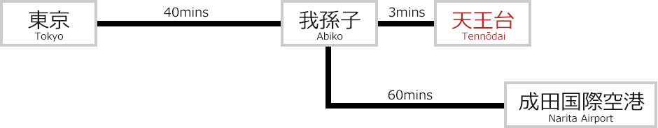 ・成田空港駅から電車で70分(成田空港線「成田空港」→成田線「成田」→「我孫子」→常磐線「天王台」)